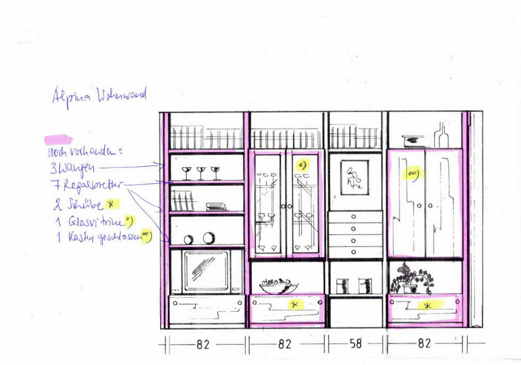 Alpina Wohnwand, nicht mehr ganz vollständig, aber zu einer kleineren zusammenbaubar. Siehe hierzu Foto (rote Teile und Kommentar).